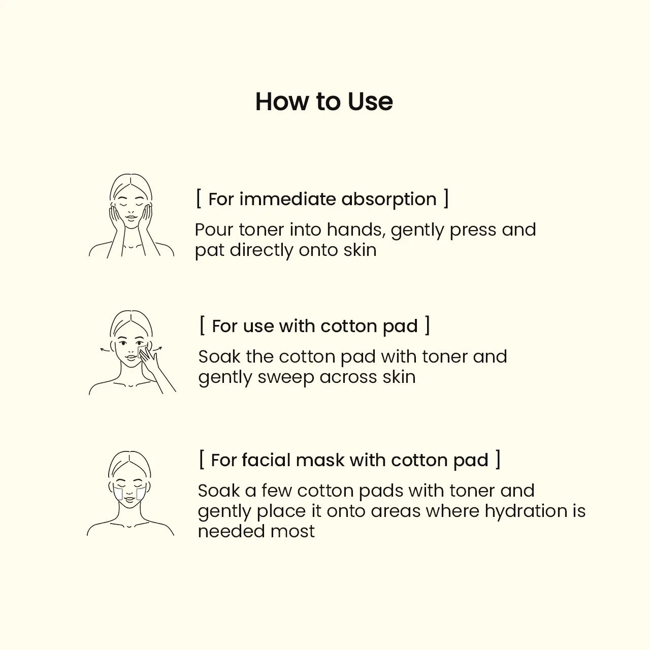 Soak a cotton pad with toner and gently swipe across the face and neck, or pour into your hands and pat onto the skin for absorption.