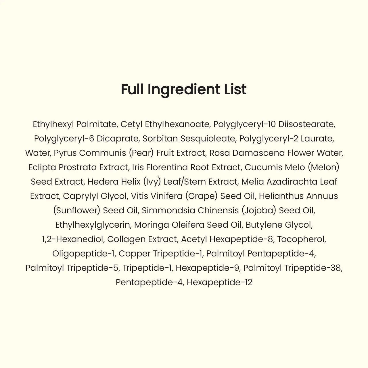 Ethylhexyl Palmitate, Cetyl Ethylhexanoate, Polyglyceryl-10 Diisostearate, Polyglyceryl-6 Dicaprate, Sorbitan Sesquioleate, Polyglyceryl-2 Laurate, Water, Pyrus Communis (Pear) Fruit Extract, Rosa Damascena Flower Water, Eclipta Prostrata Extract, Iris Florentina Root Extract, Cucumis Melo (Melon) Seed Extract, Hedera Helix (Ivy) Leaf/Stem Extract, Melia Azadirachta Leaf Extract, Caprylyl Glycol, Vitis Vinifera (Grape) Seed Oil, Helianthus Annuus (Sunflower) Seed Oil, Simmondsia Chinensis (Jojoba) Seed Oil, Ethylhexylglycerin, Moringa Oleifera Seed Oil, Butylene Glycol, 1,2-Hexanediol, Collagen Extract, Acetyl Hexapeptide-8, Tocopherol, Oligopeptide-1, Copper Tripeptide-1, Palmitoyl Pentapeptide-4, Palmitoyl Tripeptide-5, Tripeptide-1, Hexapeptide-9, Palmitoyl Tripeptide-38, Pentapeptide-4, Hexapeptide-12